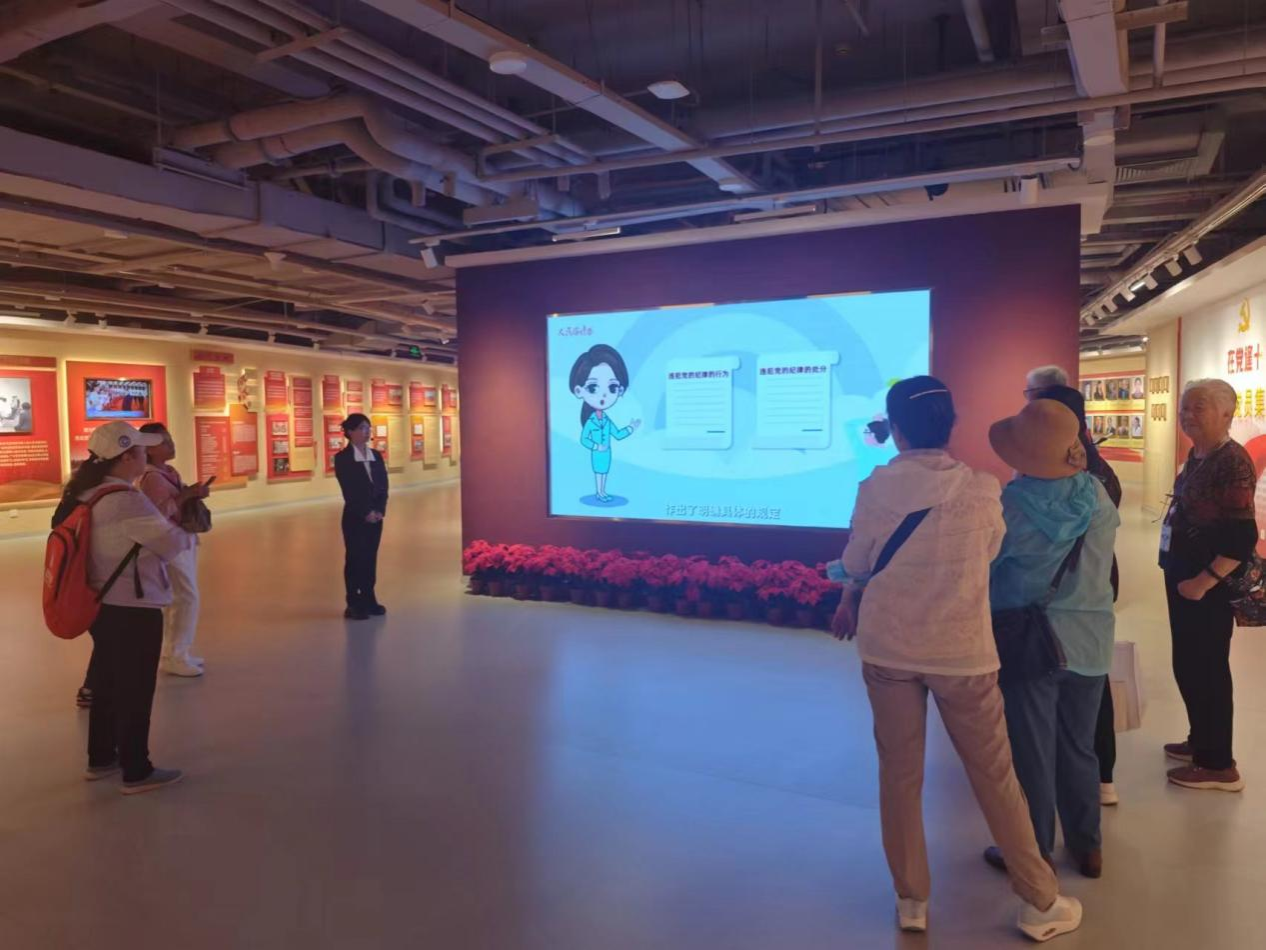 参观开始,讲解员通过大屏幕播放了党纪教育学习视频,老同志们驻足观看,通过播放的动画对新修订的《中国共产党纪律处分条例》进行了深入学习,进一步严明党的政治纪律和政治规矩,带动各项纪律全面从严,不断增强自我净化、自我完善、自我革新、自我提高能力。