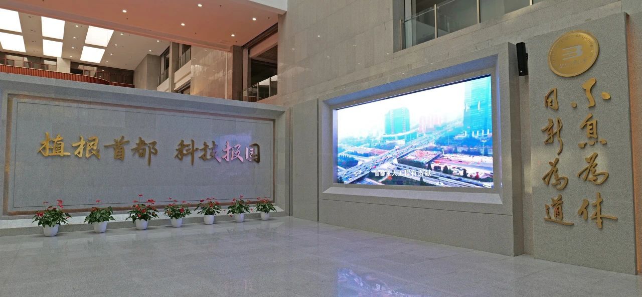 进入一层大厅,墙上展示着校徽、校歌、校训及初心使命,代表着北工大人坚持以服务国家、服务首都为最高追求,实干担当、守正创新,秉承“不息为体,日新为道”的校训精神,传承“植根首都、科技报国”的初心使命,奋力谱写新时代高质量发展的北工大篇章。