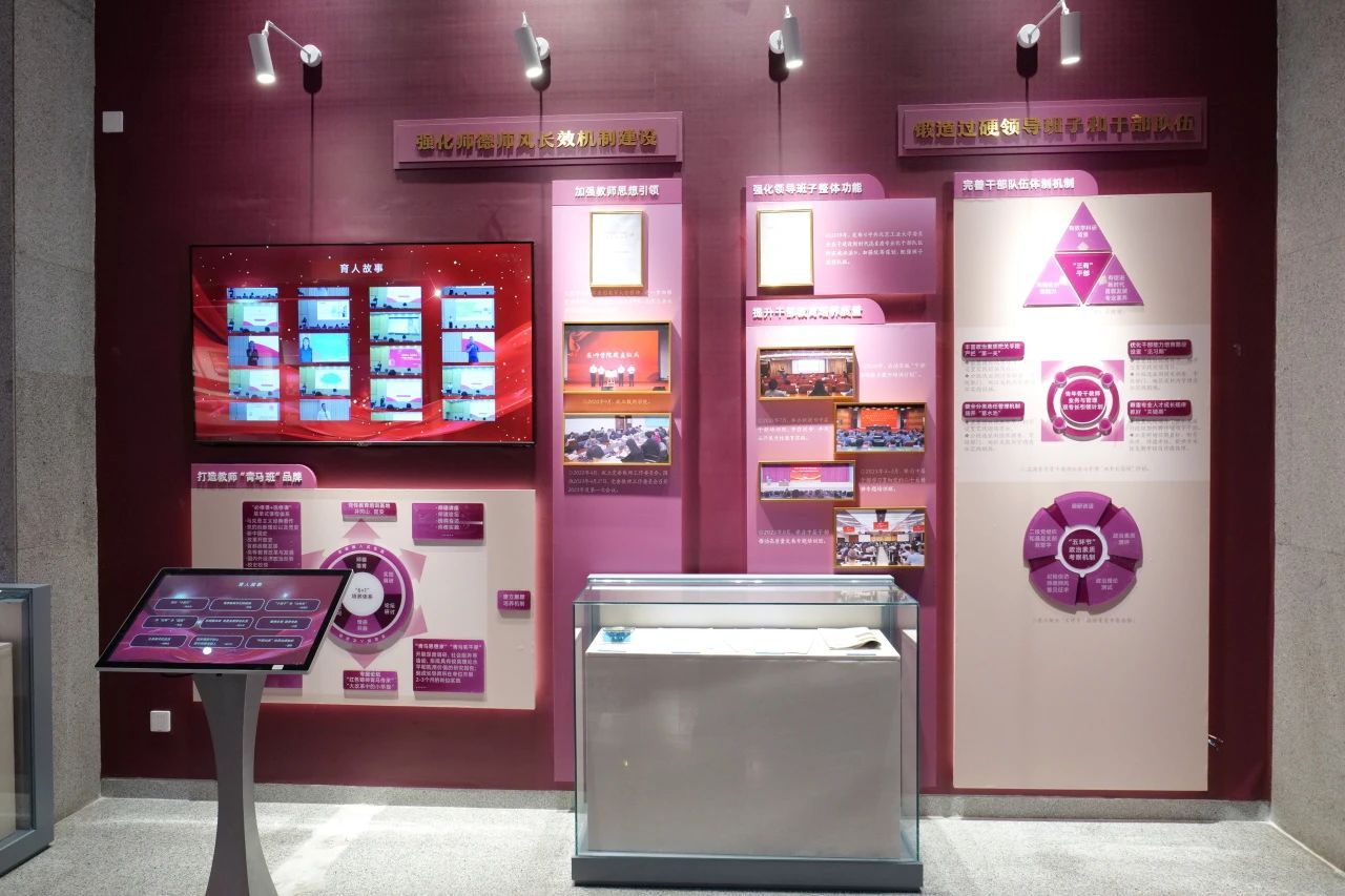 第五展区重点展示新时代学校内部治理取得的成效。持续深化综合改革,持续改善办学条件,坚持“三风”建设,推进文化传承创新。