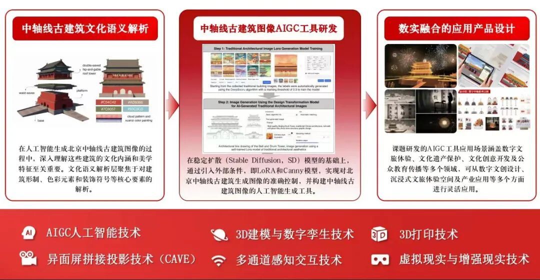 项目自研高精度AI图像生成工具,以Stable Diffusion+LoRA+Canny边缘检测为核心,高保真还原北京中轴线古建筑形制、色彩与装饰,生成效果优于通用生图模型,设计周期显著缩短、设计效率显著提高。已落地沉浸式文旅、AR文创、美育课堂,实现文化遗产数字化活化与产业化。