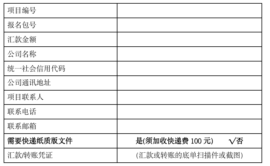 1)填写下表,连同电汇底单(网银转账页面或银行回单)扫描件发送至bjmdzx@vip.163.com。邮件主题请务必为“购买标书登记+项目编号(BMCC开头)+项目名称”。报名后我司将回复邮件告知报名结果,请关注邮件及相关附件。