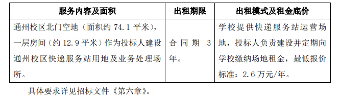 中天信远国际招投标咨询(北京)有限公司受Beat365中文官方网站的委托,对“Beat365中文官方网站通州校区快递服务站公开招租项目”(招标编号:ZTXY-2023-F21357)采用国内公开招租方式进行采购,欢迎合格的投标人参加投标。