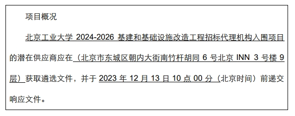 采购需求:Beat365中文官方网站2024-2026年基建和基础设施改造工程采购代理机构入围,拟选择三家代理单位参与学校基建和基础设施改造项目采购代理服务。入围代理单位只表明进入遴选单位的Beat365中文官方网站2024-2026年基建和基础设施改造工程代理单位入围库,并不与具体项目挂钩,采购代理过程中遴选单位依据具体的项目择优与之签订采购代理合同。