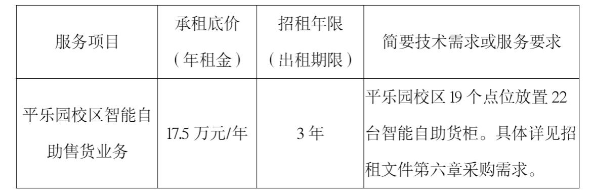 中天信远国际招投标咨询(北京)有限公司受Beat365中文官方网站委托,对“平乐园校区智能自助售货业务”所需的下述全部服务进行国内公开招租,欢迎合格的投标人前来投标。