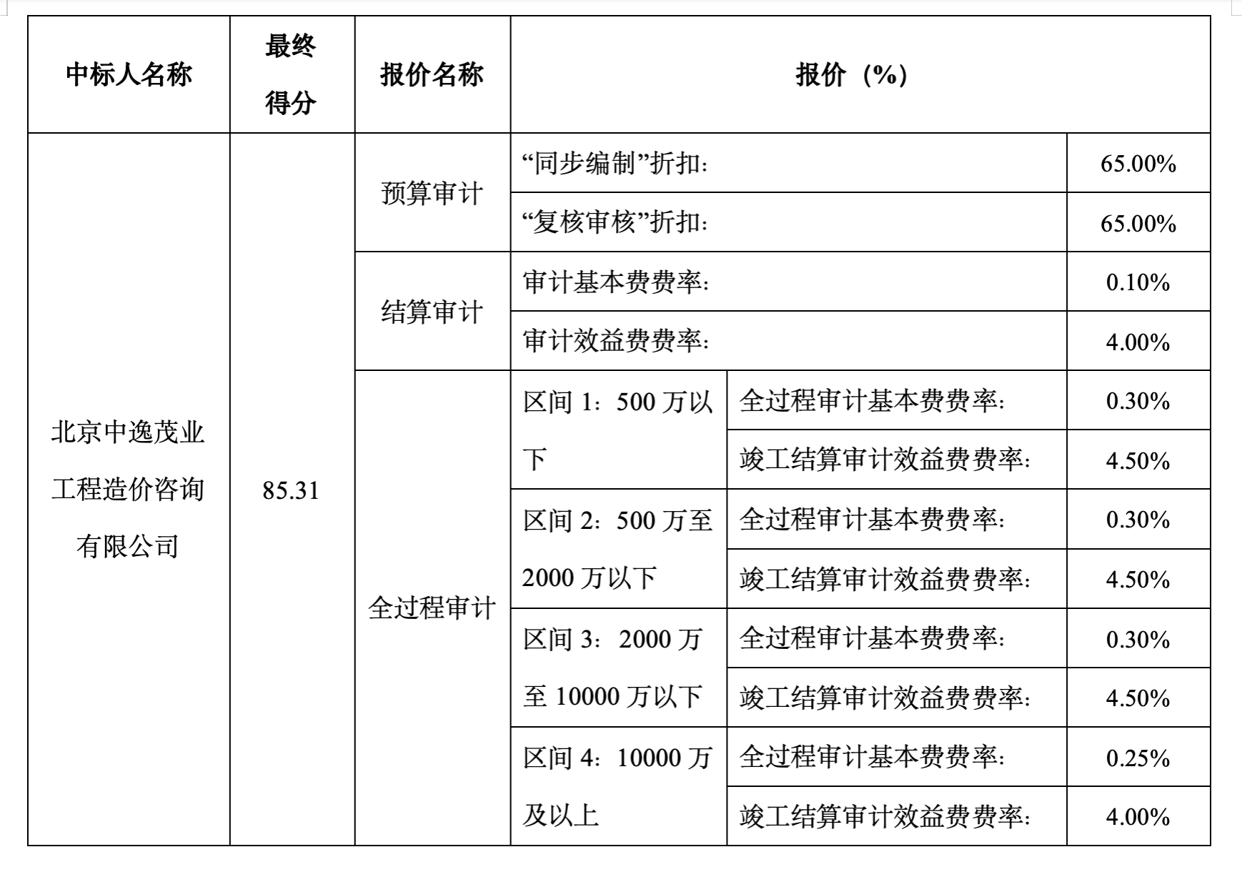 供应商名称:北京中逸茂业工程造价咨询有限公司