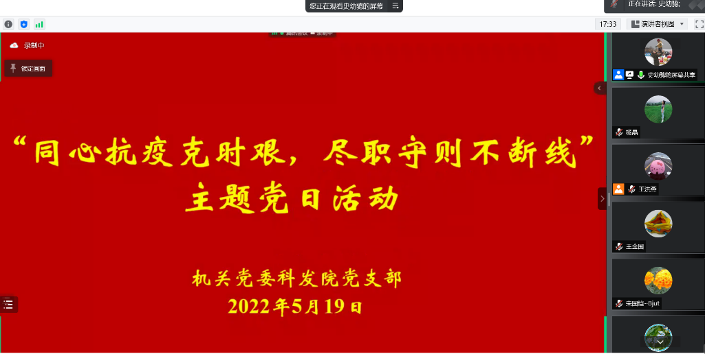 为进一步贯彻落实我校疫情防控各项工作部署,增强全体党员的责任感和使命感,把疫情防控期间各项科研管理工作推进作为“我为群众办实事”的生动实践,2022年5月19日,科发院党支部在线上组织召开了“同心抗疫克时艰,尽职守则不断线”主题党日活动,活动由党支部副书记史幼骢同志主持,科发院全体教职工参加活动。