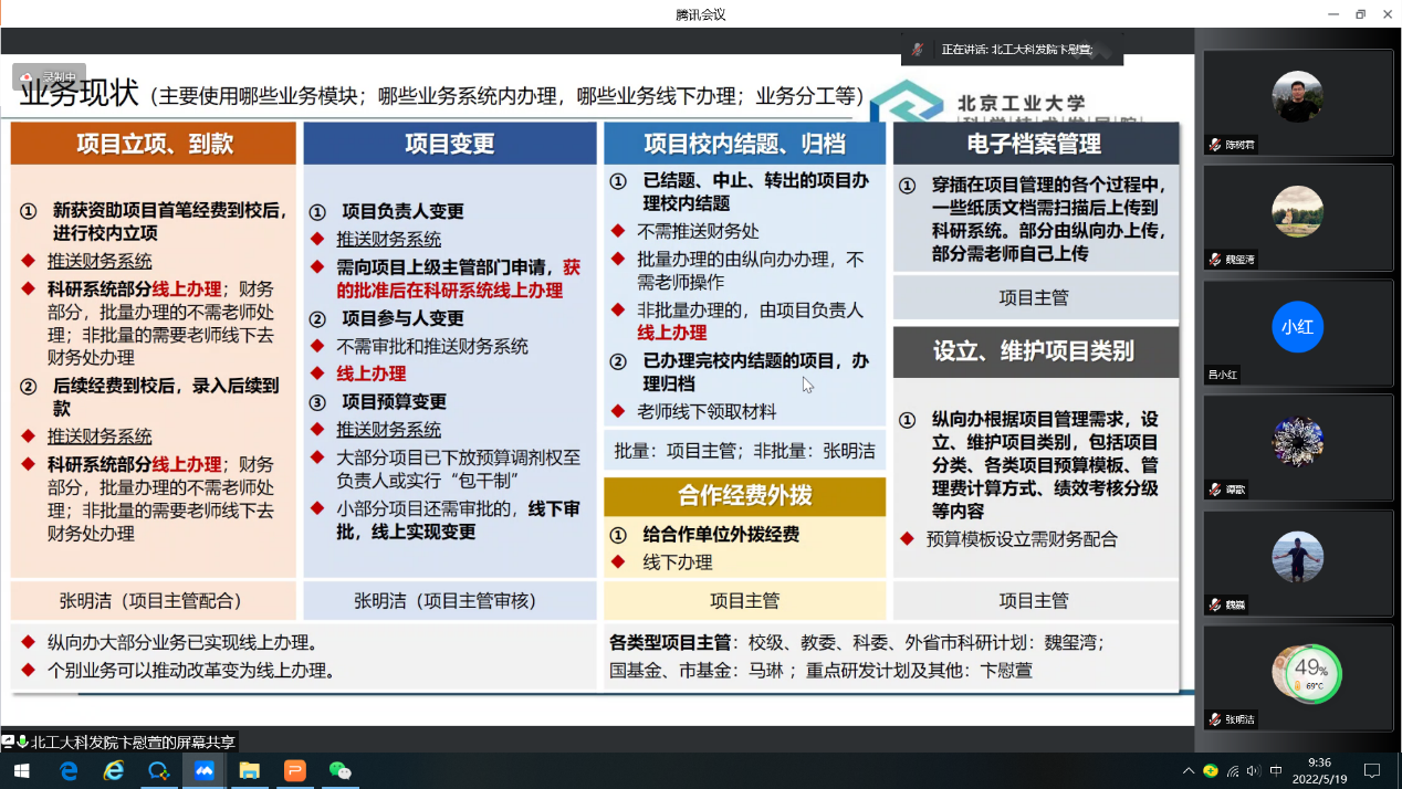 活动第三项是疫情常态化模式下积极加快推进科研服务信息化建设的深度交流研讨,具体内容为科研系统V8升级建设方案规划与需求交流。九位办公室主任结合本部门工作,从和系统相关的业务现状、存在问题、升级建设方案和需求等方面依次进行了汇报交流,分管领导对跨部门业务沟通、流程梳理再造、数据分析决策等方面进行了重点强调。