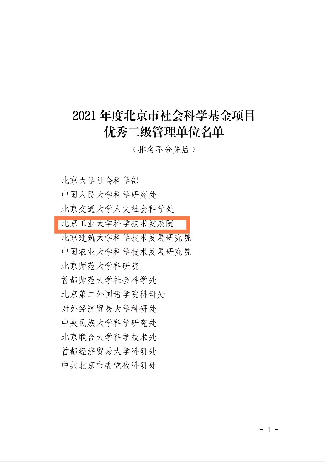 近日,接北京市社会科学界联合会、北京市哲学社会科学规划办公室通知,我校科学技术发展院获评“2021年度北京市社会科学基金项目优秀二级管理单位”;由此我校获得2022年度北京市社科基金项目申报追加名额奖励。