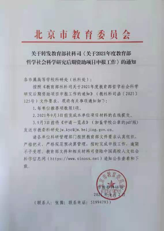 近日,北京市教委科研处下发了关于转发教育部社科司《关于2021年度教育部哲学社会科学研究后期资助项目申报工作的通知》(详见附件),根据通知要求,我校的申报工作安排如下: